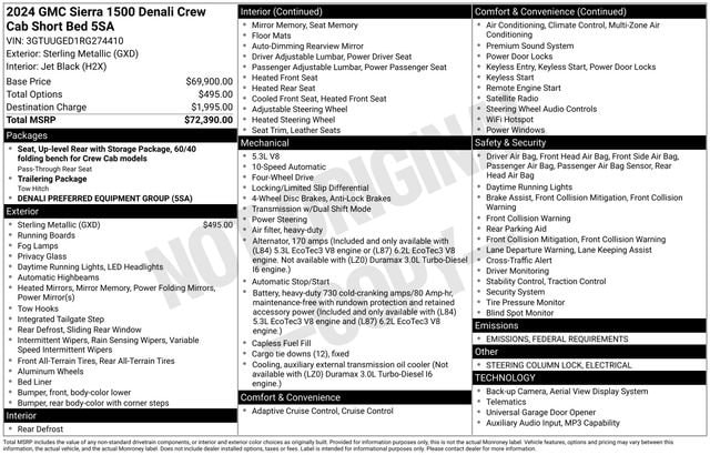Sterling Metallic 2024 GMC Sierra 1500 Denali 4D Crew Cab CARFAX One-Owner. Clean CARFAX. Certified.ONE OWNER!, Accident Free, APPLE CAR PLAY / ANDROID AUTO, HEATED / COOLED SEATS, BACKUP CAMERA, REMOTE START, Sierra 1500 Denali, 4D Crew Cab, EcoTec3 5.3L V8, 10-Speed Automatic, 4WD, Sterling Metallic, Jet Black Leather, 120-Volt Interior Power Outlet, 170 Amp Alternator, 2 Charge/Data USB Ports Inside Center Console, 2 Type-C Charge-Only Rear USB Ports, 2 USB Ports, Auto-Locking Rear Differential, Auxiliary External Transmission Oil Cooler, Bed View Camera, Chrome Header w/Signature Denali Chrome Grille, Chrome Recovery Hooks, Chrome Wheel To Wheel Assist Steps, Color-Keyed Carpeting Floor Covering, Deep-Tinted Glass, Electric Rear-Window Defogger, Floor-Mounted Center Console, Front Rain-Sensing Wipers, GMC Connected Access Capable, HD Surround Vision, Heated 2nd Row Outboard Seats, Heated Driver & Front Outboard Passenger Seating, Heavy-Duty Air Filter, Hill Descent Control, Hitch View, In-Vehicle Trailering System App, Integrated Trailer Brake Controller, Keyless Open & Start, LED Cargo Area Lighting, Navigation System, OnStar & GMC Connected Services Capable, Perimeter Lighting, Power Door Locks, Power Front Passenger Windows w/Express Up/Down, Power Front Windows w/Driver Express Up/Down, Power Rake & Telescoping Steering Column, Power Rear Windows w/Express Down, Power Sliding Rear Window w/Rear Defogger, Preferred Equipment Group 5SA, Premium Bose 7-Speaker Sound System, Push Button Start, Rear Cross Traffic Braking, Rear Pedestrian Detection, Rear Wheelhouse Liners, Remote Vehicle Starter System, SiriusXM w/360L, Spray-On Pickup Bedliner w/Denali Logo, Steering Wheel Audio Controls, Theft Deterrent System (Unauthorized Entry), Trailer Camera Provisions, Trailer Side Blind Zone Alert, Trailering Package, Ultrasonic Front & Rear Park Assist, Universal Home Remote, Ventilated Driver & Front Passenger Seats, Wi-Fi Hotspot Capable, Wireless Charging.Odometer is 7248 miles below market average! 15/19 City/Highway MPG Priced below KBB Fair Purchase Price!GMC Certified Pre-Owned Details:* Roadside Assistance* Powertrain Limited Warranty: 72 Month/100,000 Mile (whichever comes first) from original in-service date* 172 Point Inspection* 24 months/24,000 miles (whichever comes first) Certified Pre-Owned Scheduled Maintenance Plan and 3 days/150 miles (whichever comes first) Vehicle Exchange Program. SiriusXM 3-month trial subscription* Transferable Warranty* Limited Warranty: 12 Month/12,000 Mile (whichever comes first) from certified purchase date* Warranty Deductible: $0* Vehicle HistoryAs you do your comparison shopping, you will see Fletch's Of Petoskey offers some of the best values in the market. We will provide you a Carfax, Comprehensive Vehicle Inspection, and how we arrived at the price. We may not always be the lowest but if you want to know who is; we will show you that too. Call or Stop by Fletch's of Petoskey, Michigan to schedule a test drive today.