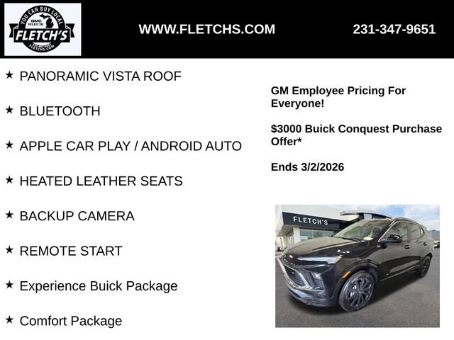 Discover the 2026 Buick Encore GX Sport Touring, a compact SUV that seamlessly blends style, technology, and capability. This sleek and sophisticated vehicle is poised to elevate your driving experience. Panoramic Vista Roof Bluetooth Apple CarPlay / Android Auto Heated Leather Seats Backup Camera Remote StartThe Encore GX Sport Touring comes equipped with the ECOTEC 1.3L Turbo engine, paired with a 9-Speed Automatic transmission and All-Wheel Drive, delivering a dynamic and efficient performance. With an EPA-estimated 26 city / 28 highway MPG, this SUV offers the perfect balance of power and fuel economy.Elevate your commute with the Comfort Package and Experience Buick Package, which include features like an 8-Way Power Driver Seat, Power Panoramic Tilt-Sliding Moonroof, Power Liftgate, Heated Steering Wheel, and more. The Encore GX Sport Touring is designed to keep you connected, comfortable, and in control.Exterior styling is enhanced with Gloss Black Aluminum wheels, a sporty Spoiler, and Body-Color Bumpers, creating a bold and refined presence on the road. The sleek and modern design is complemented by thoughtful safety features, including Dual Front Impact Airbags, Dual Front Side Impact Airbags, and Electronic Stability Control.Inside, the Encore GX Sport Touring offers a spacious and well-appointed cabin with Leatherette Seat Trim, a Front Center Armrest, and a Split Folding Rear Seat, providing the versatility to accommodate your lifestyle. Stay connected with Wireless Apple CarPlay and Wireless Android Auto, while the Enhanced Performance 7-Speaker System with Amplifier delivers a premium audio experience.Experience the exceptional craftsmanship and attention to detail that define the 2026 Buick Encore GX Sport Touring. Visit our showroom today to see this remarkable SUV in person and discover how it can enhance your driving adventures.We'll Buy your Car Hassle-Freehttps://www.audipetoskey.com/en/specials-and-finance/value-my-trade/