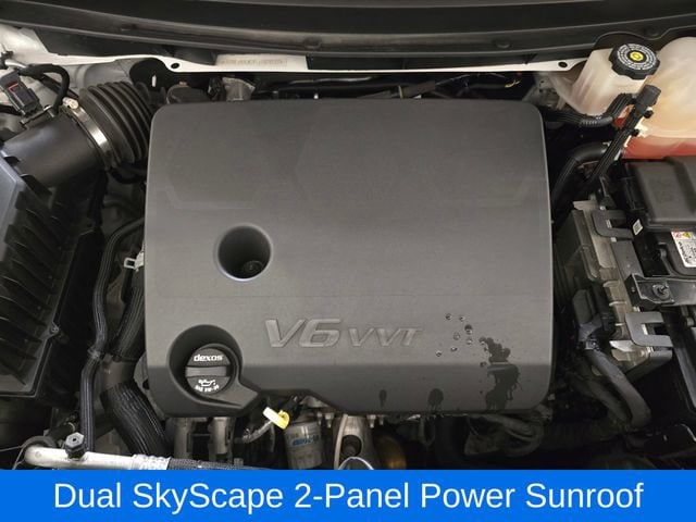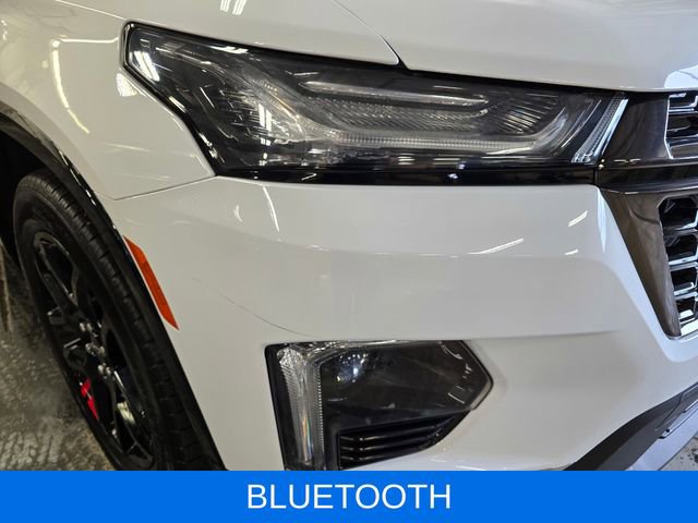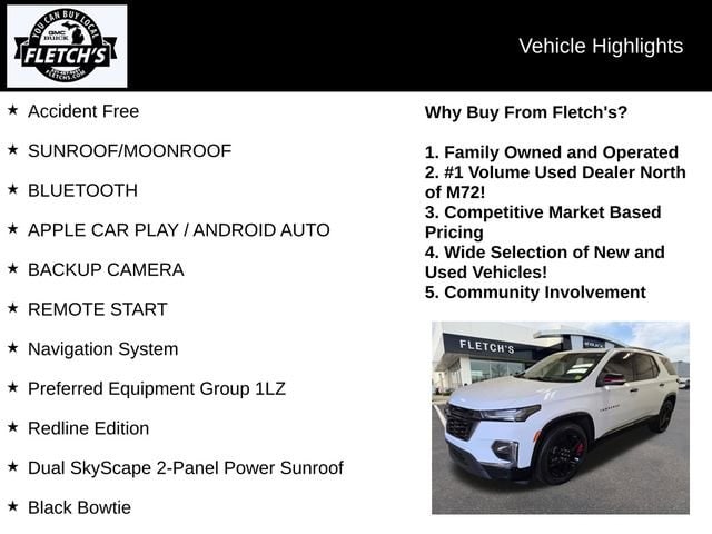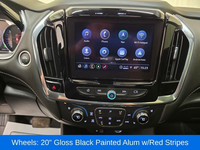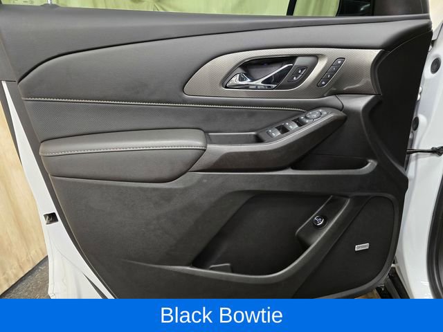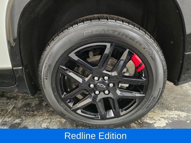 Indulge in the premium features that set this Traverse apart, including the Black Bowtie, Black Door Handles, Redline Accent Decals, Navigation System, Heated and Ventilated Front Seats, Heated Second-Row Seats, and the Dual SkyScape 2-Panel Power Sunroof. The 20-inch Gloss Black Painted Aluminum Wheels with Red Stripes add a bold, stylish touch.