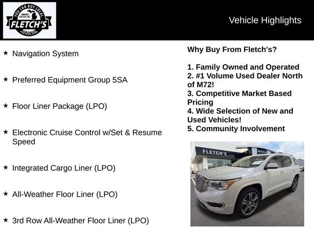 Acadia Denali, 4D Sport Utility, 3.6L V6 SIDI, 6-Speed Automatic, AWD, White Frost Tricoat, Cocoa/ Shale Leather, 3rd Row All-Weather Floor Liner (LPO), All-Weather Floor Liner (LPO), Electronic Cruise Control w/Set & Resume Speed, Floor Liner Package (LPO), Integrated Cargo Liner (LPO), Navigation System, Preferred Equipment Group 5SA.