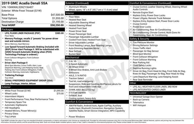 White Frost Tricoat 2019 GMC Acadia Denali 4D Sport Utility Once you've found your perfect match, our hassle-free delivery process ensures that your dream car is delivered to your doorstep promptly and securely!