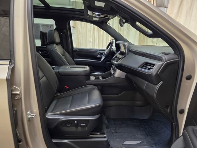 The exterior of this Yukon XL SLT exudes a commanding presence, with its Beige Metallic paint and chrome accents. The panoramic vista roof floods the cabin with natural light, creating an airy and open atmosphere. Stepping inside, you'll be greeted by the luxurious Tan leather interior, which offers unparalleled comfort and style.